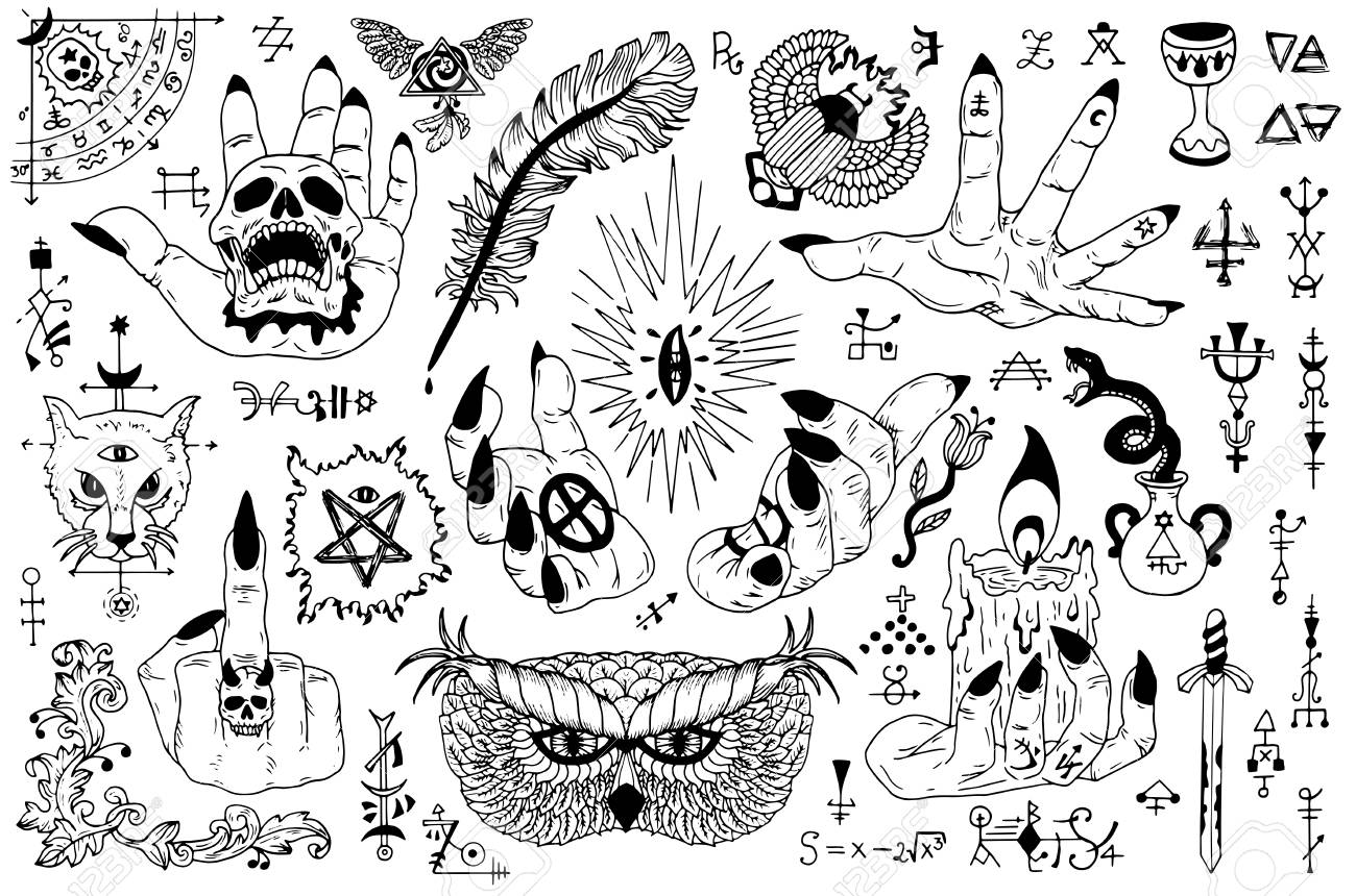 Premium Vector Mystical Magic Engraving Illustrations Set Hand Drawn Tattoo Style Color Sketches Of Crystall Ball Snake Scull Key And Stars Halloween Palmistry And Alchemy Symbols Collection